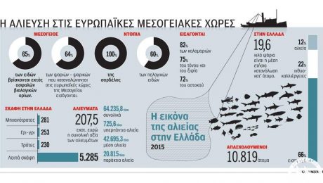 Καθημερινή, Γιάννης Ελαφρός, 23/01/2016 Λιγότερα και μικρότερα είναι τα ψάρια που αλιεύονται από τις ελληνικές θάλασσες, αλλά κι ευρύτερα από τη Μεσόγειο. Σύμφωνα με ευρωπαϊκά στοιχεία το 96% των πληθυσμών βαθύβιων ψαριών υπεραλιεύεται, ενώ για τα πελαγικά είδη, όπως η σαρδέλα και ο γαύρος, το ποσοστό αυτό είναι τουλάχιστον 71%. Το πρόβλημα της υπεραλίευσης παραμένει