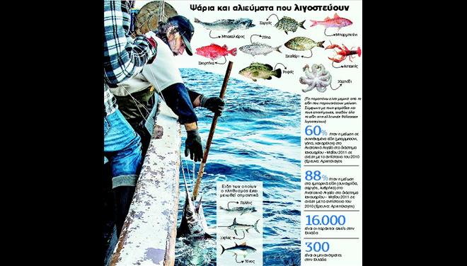 «Μειώσεις παρατηρούμε σχεδόν σε όλα τα ψάρια. Εχουμε χάσει πλέον το μεγάλο μέγεθος. Ενα από τα είδη που πιάνουμε όλο και σπανιότερα είναι η σκορπίνα» λέει ο πρώην πρόεδρος της Ομοσπονδίας Συλλόγων Παράκτιας Αλιείας στη Νότια Ελλάδα Δημήτρης Ζάννες. Ο ροφός, η γόπα, ο σαργός, το μπαρμπούνι είναι επίσης μερικά είδη μεταξύ των πολλών που ολοένα και λιγοστεύουν, σύμφωνα με τους αλιείς.
