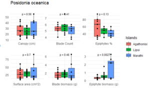 So far, the P. oceanica meadows of the studied sites show similar characteristics in terms of canopy height, number of blades, surface of the blades, biomass of the blades and epiphyte cover. The meadows of Marathi Island showed greater epiphyte biomass compared to the other islands (Figure 2). Further studies will be conducted in order to unveil the reasons of these differences.