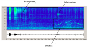 Fig. 2: Spectrogram of dolphin acoustics; visualisation of burst pulses, clicks and whistles
