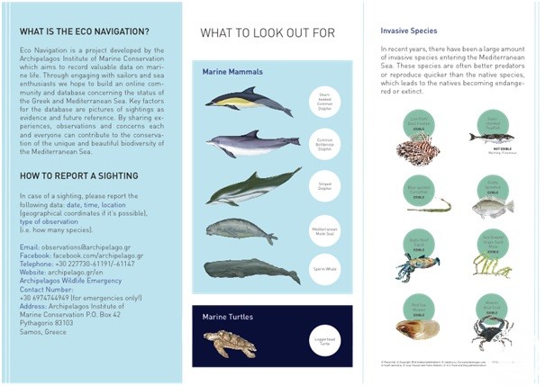 Eco-Navigation is a key action developed by Archipelagos Institute, aiming to increase awareness but also public engagement on the biodiversity and conservation of the Mediterranean Sea. Eco-Navigation aims to record valuable data, through reported sightings by sailors and sea enthusiasts on their observations of rare and protected animals such as marine mammals and turtles, or invasive species, jellyfish blooms or pollution incidents. This information that would have otherwise been missed, enables us to acquire extra data, coupling those gathered by our research teams, achieving through this citizen-science platform a more completed monitoring of the key species of interest that are monitored by Archipelagos Institute.