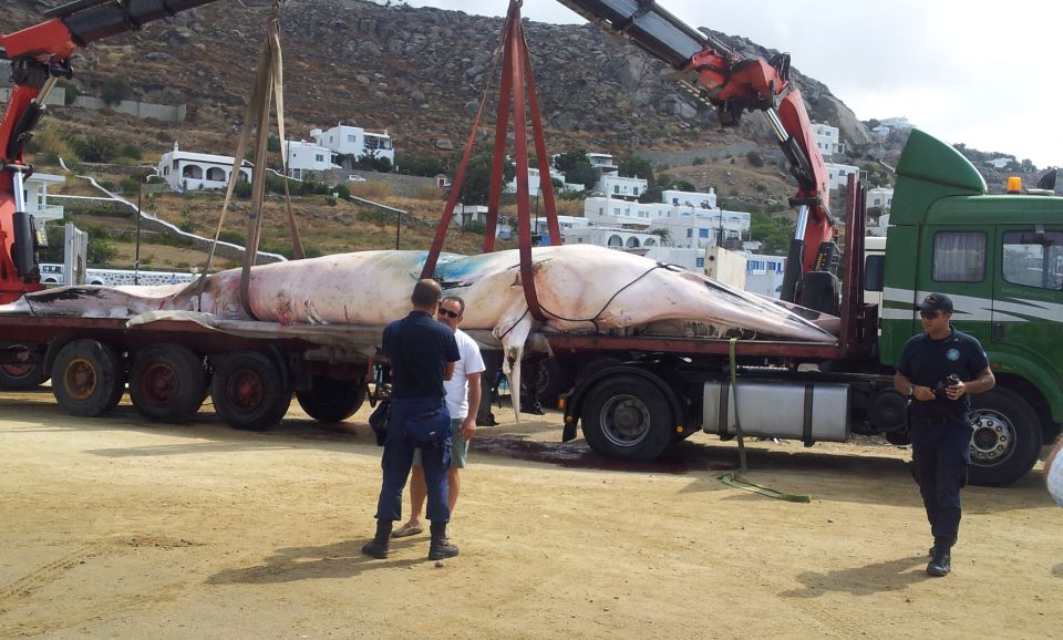 A juvenile Fin Whale (Balaenoptera physalus) measuring 12.60m in length and weighing 8.3 tonnes was found stranded on Friday 23rd September 2011 on Mikri Venetia Beach in west Mykonos. Indications so far have led to the conclusion that the mammal died as a result of a collision with a vessel. Multiple external wounds visible on the animal, thought to be caused by a propeller, as well as obvious marks from antifouling paint are further indicative of the cause of death.
