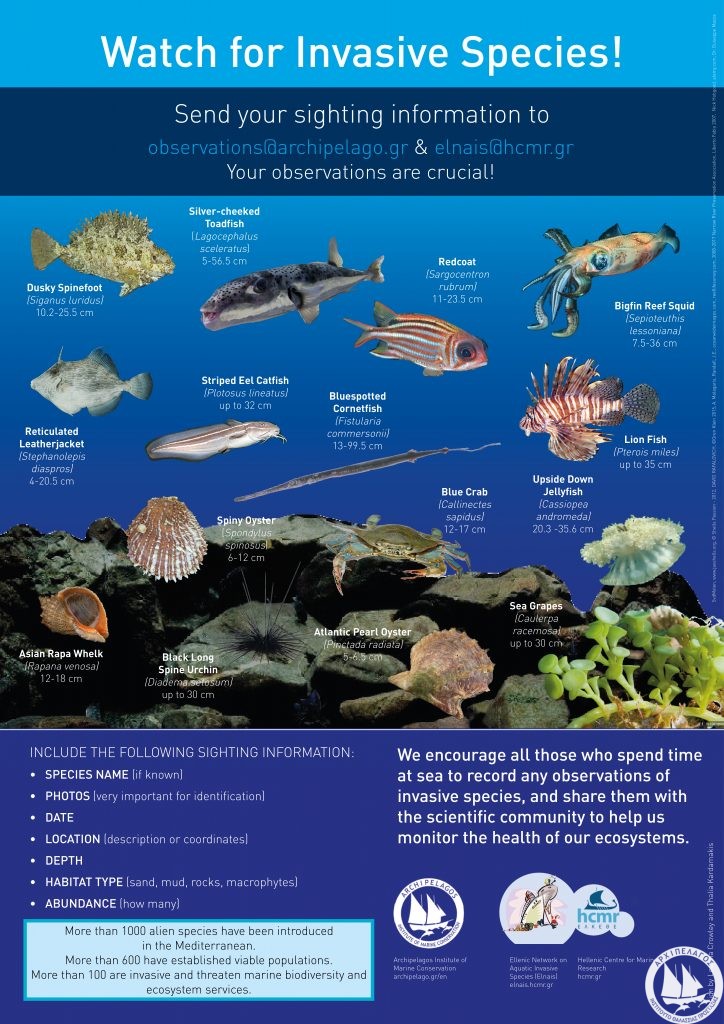 B. Awareness Raising – Engaging the Public in the Data Recording Process. For this purpose we have created informative posters in Greek and English, as well as a booklet and a leaflet informing key target groups about invasive species. In this way we want to encourage all those who spend time at sea (fishermen, divers, snorkelers, sailors) to record any observations of invasive species and share them with the scientific community to help us monitor the health of our ecosystems. This endeavor is carried out in cooperation with the ELNAIS, the Ellenic Network on Aquatic Invasive Species of the Hellenic Center of Marine research.