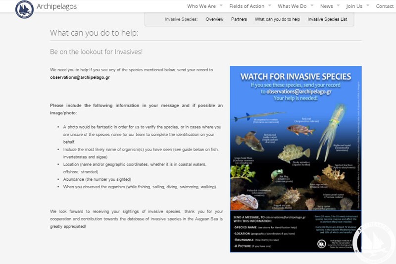 Archipelagos has set up a “citizen-science” network with the aim of encouraging fishermen, divers, sailors and other sea enthusiasts to identify and report invasive species they might encounter in the Greek Seas and the NE Mediterranean Sea.