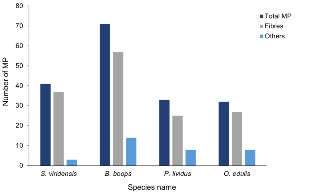 Figure 4. Average number of microplastics found in two fish species (S. viridensis, B. boops) and two invertebrate species (P. lividus, O. edulis). Fibres were the most abundant type of microplastic detected in all samples.