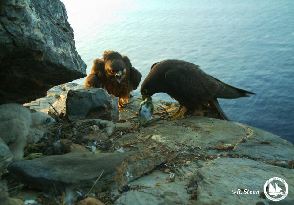 For third successive year, Archipelagos Institute in cooperation with scientists from Norwegian University of Life Sciences, continues the innovative action of monitoring the nesting behavior of the rare Eleonora’s falcon (Falco eleonorae). Every spring they migrate from Madagascar to the Mediterranean and mainly to the Aegean, where 2/3 of the global population of this rare species are nesting. Research focuses on small uninhabited islets of the Permanent Wildlife Refuge of Arki and N. Patmos.