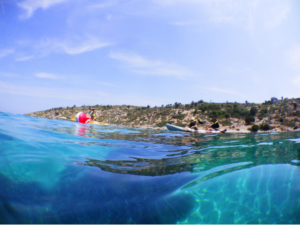 Figure 3: Vroulia Bay: Transport of the hessian bags full of seagrass to the transplantation (Credits: Margot Guillaume – Archipelagos)