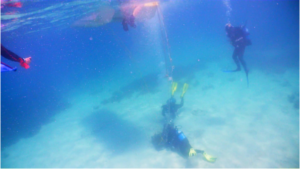 Figure 4: Vroulia Bay: Reception of hessian bags by divers (Credits: Margot Guillaume – Archipelagos)