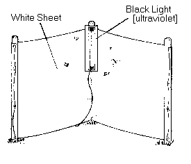 The insects are then either collected or photographed to be identified back at the base. Method 2 involves the use of a light trap. This involves placing a light in front of a white sheet, which inevitably attracts nocturnal flying insects such as moths and butterflies (Figure 3). Once on the sheet, they are again photographed or taken in jars for identification. Finally, the last method involved no trapping but simply walking a line transects of approximately 20 metres and taking photos and notes of any insects seen off the transect at no further than 5 metres. All of these methods combined ensured a variety of habitats were covered, therefore allowing for a larger range of insect diversity.