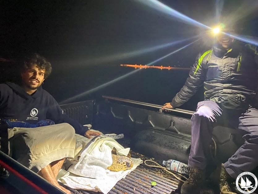 Archipelagos – Institute of Marine Conservation was immediately contacted by the locals and Archipelagos’ Stranding Response Team collected the turtles and provided first aid at Samos research base. They were finally transferred to the Sea Turtle Rescue Center of ARCHELON the Sea Turtle Protection Society of Greece in Athens, where they are being treated. Attica Group and Blue Star Ferries Company helped, once again, in these incidents by safely transporting the turtle to Piraeus.