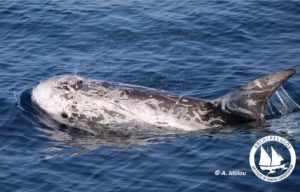 Cuvier’s beaked whales and sperm whales are deep-diving species that can descend to more than 1000 meters and stay underwater for over an hour. Little information is available on their distribution in the Mediterranean, due to their short surface period and long dive time, making it difficult to observe them at open sea. Archipelagos’ Marine Mammal research team surveys the trench as many times as possible in the year in order to gather information on these understudied species. In the past six weeks, we have already been able to collect data on Cuvier’s beaked whales on three separate occasions. Photographic and behavioural data has also been collected on the Risso’s dolphin (Grampus griseus). This migratory species, found within small groups, feed on cephalopods such as squid. Risso’s dolphins are easy to identify due to their white scars, which increase with age.