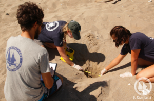 The Archipelagos research team collecting data on a turtle nest found on Samos Island.