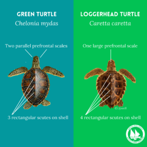 Physical differences between the green turtle (Chelonia mydas) and the loggerhead turtle (Caretta caretta).