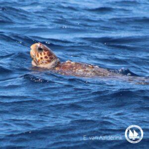 Loggerhead and green turtles are often found in coastal areas, where they feed on seagrass meadows. This loggerhead turtle was observed by our research team around Samos during one of our boat surveys.