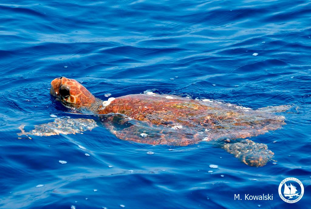 Loggerhead and green turtles are often found in coastal areas, where they feed on seagrass meadows. This loggerhead turtle was observed by our research team around Samos during one of our boat surveys.