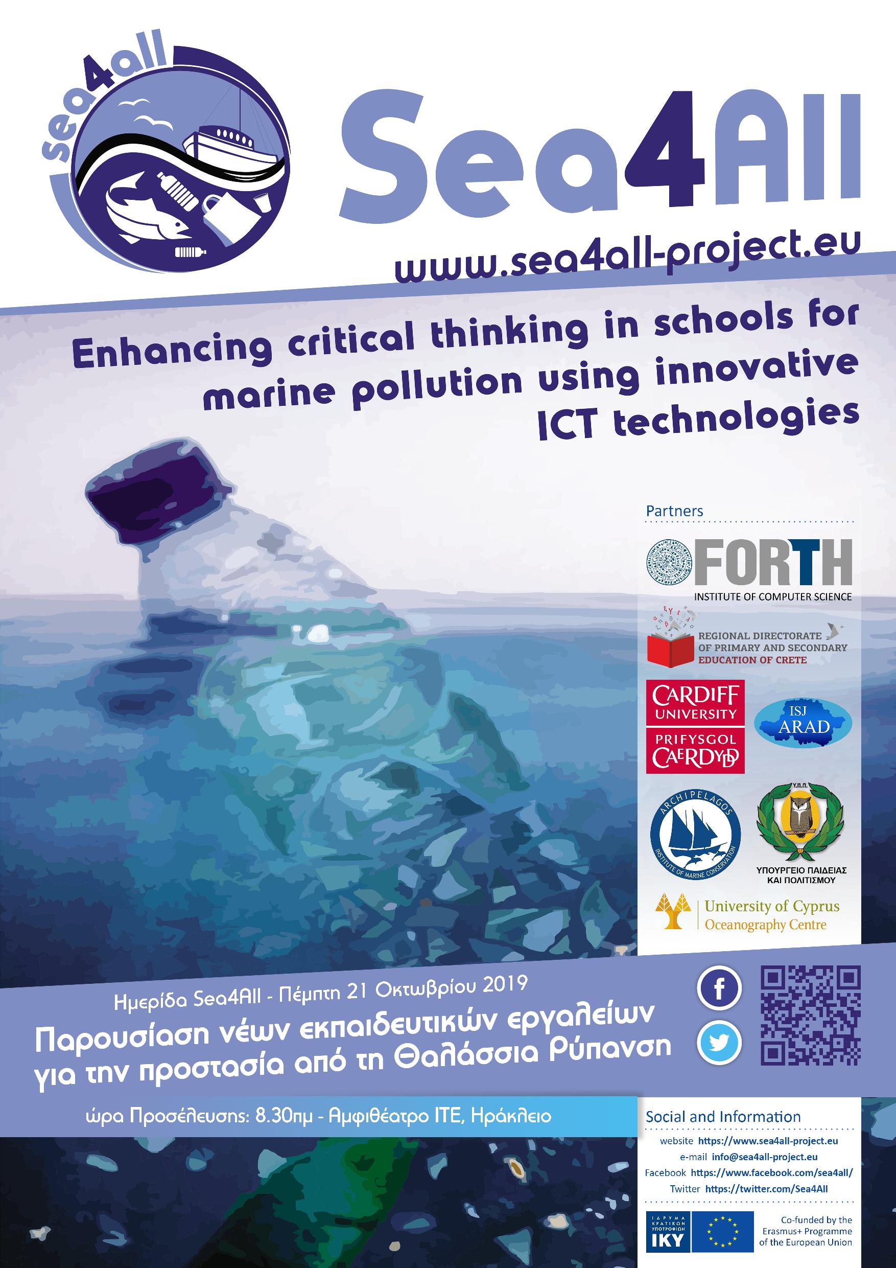 Οι εφτά εταίροι που συνέβαλαν στην ανάπτυξη του εκπαιδευτικού υλικού (Ίδρυμα Τεχνολογίας και Έρευνας, Περιφερειακή Διεύθυνση Πρωτοβάθμιας και Δευτεροβάθμιας Εκπαίδευσης Κρήτης, Πανεπιστήμιο Cardiff, Σχολική Επιθεώρηση του νομού Αράντ της Ρουμανίας, Ινστιτούτο Θαλάσσιας Προστασίας «Αρχιπέλαγος», Κυπριακό Παιδαγωγικού Ινστιτούτο και Πανεπιστήμιο Κύπρου) στο πλαίσιο του προγράμματος Erasmus+, παρουσίασαν τα τελικά εκπαιδευτικά εργαλεία. Αυτά περιλαμβάνουν ένα ηλεκτρονικό παιχνίδι (sea4allseriousgame), μια πλατφόρμα ηλεκτρονικής μάθησης (e-learning), ένα εκπαιδευτικό πρόγραμμα σπουδών (sea4alltrainingcurriculum) και έναν παιδαγωγικό οδηγό (sea4all Pedagogical Handbook) με τίτλο : “10 Παιδαγωγικές Προτάσεις πλοήγησης στη Θάλασσα του Sea4all».