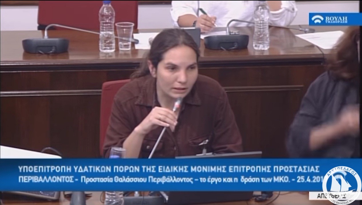 Η ομιλία έγινε στο πλαίσιο της συνεδρίασης της Υποεπιτροπής Υδατικών Πόρων, της Ειδικής Μόνιμης Επιτροπής Προστασίας Περιβάλλοντος της Βουλής, στις 25/4/2017 με θέμα Προστασία του Θαλάσσιου Περιβάλλοντος και τη δράση των μη- κυβερνητικών φορέων στον τομέα αυτό. Η Αναστασία Μήλιου – Διευθύντρια Έρευνας του Ινστιτούτου Αρχιπέλαγος, παρουσίασε τους κύριους παράγοντες απειλής για τις θάλασσες μας, καθώς και τα πολυάριθμα κενά στην εφαρμογή της ισχύουσας νομοθεσίας που συμβάλλουν στην υποβάθμιση των ελληνικών θαλάσσιων οικοσυστημάτων, της βιοποικιλότητας και των αλιευτικών πόρων.