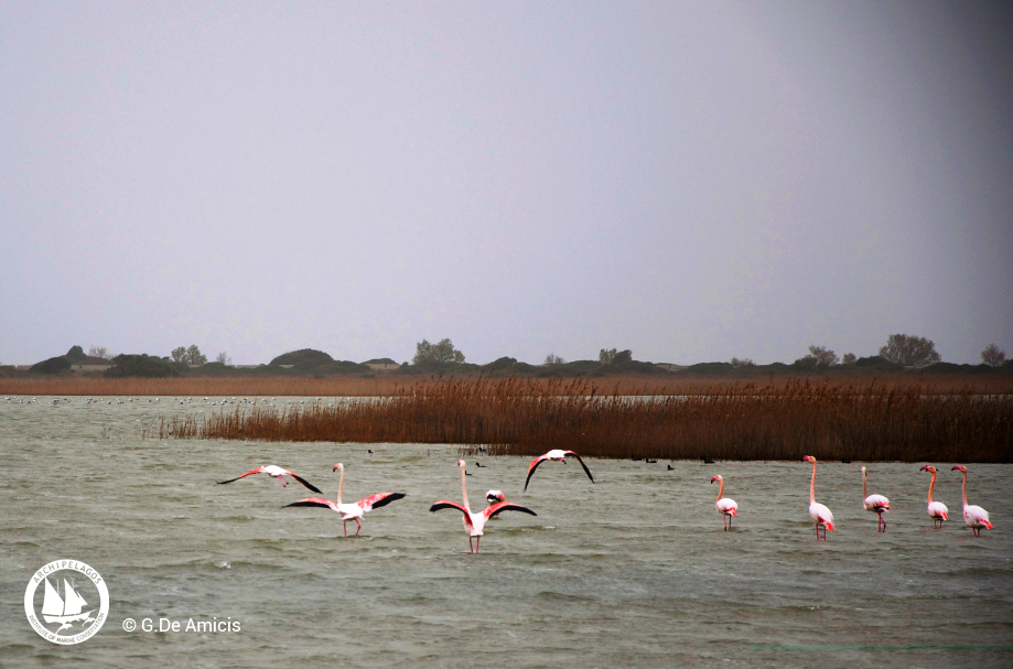 Η ομάδα χερσαίας έρευνας του Αρχιπελάγους, αποτελούμενη από ορνιθολόγους, γεωλόγους, κ.α., παρακολουθεί καθημερινά, τα τελευταία χρόνια, με επιτόπια έρευνα τόσο τη μεταναστευτική συμπεριφορά των φλαμίνγκο, όσο και τα φυσικοχημικά και υδρολογικά χαρακτηριστικά του σπάνιου αυτού οικοτόπου. Στόχος μας είναι να συμβάλλουμε με αποτελεσματικές δράσεις στη σωστή διαχείριση και τη προστασία αυτού του ξεχωριστού υδροβιότοπου.