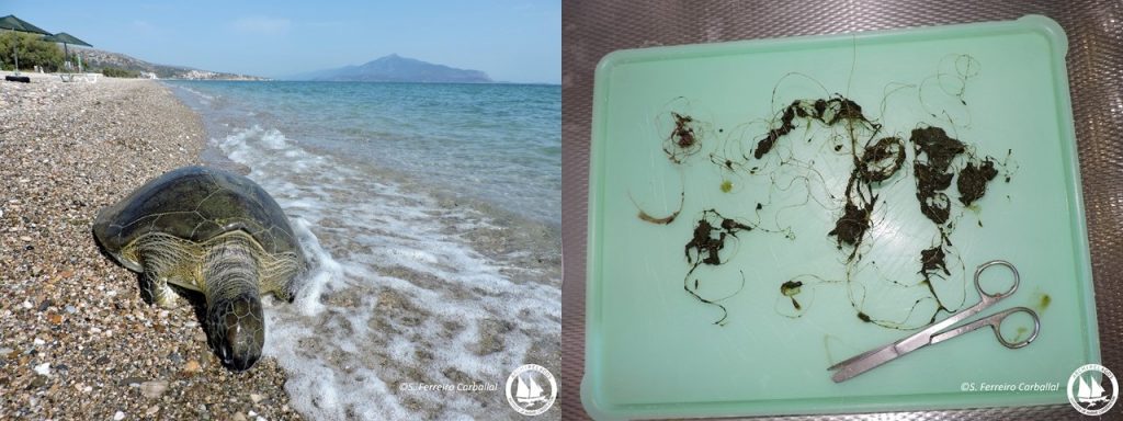 Αριστερά: Η Πράσινη χελώνα (Chelonia mydas). Δεξιά: Η πετονιά που βρέθηκε στο πεπτικό σύστημα της πράσινης χελώνας και προκάλεσε το θάνατό της
